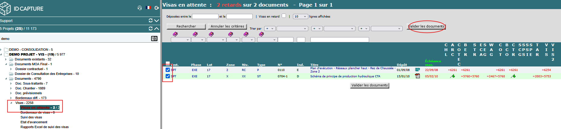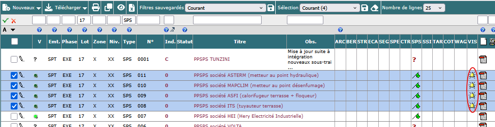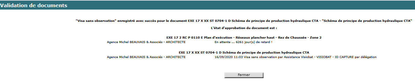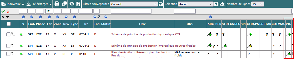 Après rafraichissement du tableau de résultat (en cliquant sur doc projet dans l'arborescence à gauche) : vous voyez les drapeaux (ici verts) vous confirmez que votre visa est bien enregistré.
