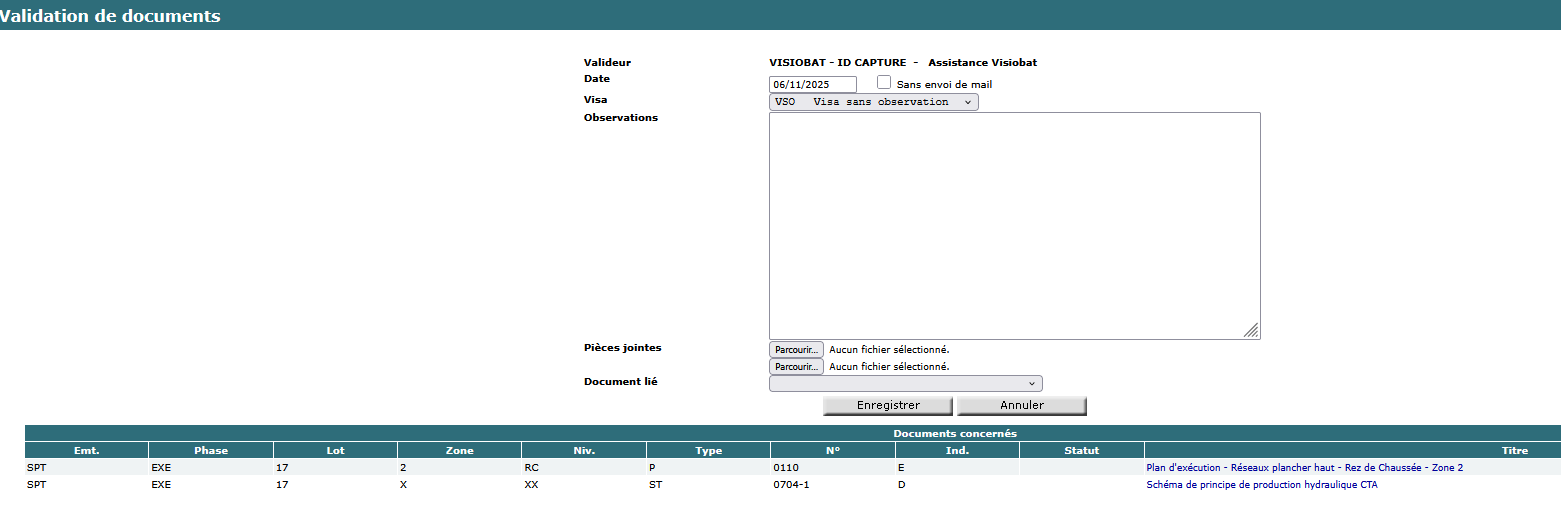 Quand vous sélectionnez les documents concernés, la commande "Valider les documents" apparaît en haut et en bas de page :