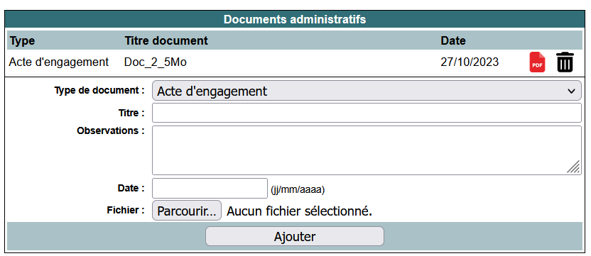 Sur cette même page, vous trouverez le cadre "Documents administratifs" où vous pouvez déposer tous les documents nécessaires comme l'acte d'engagement, le CCAP, le DC4,...